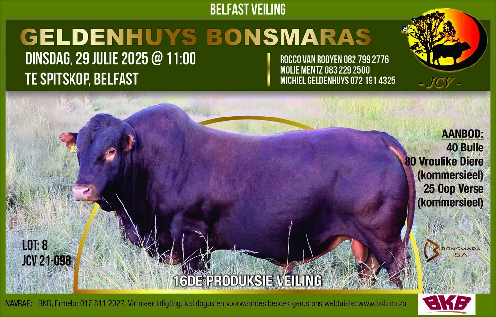 In opdrag van die 16de Produksie veiling van Geldenhuys Bonsmaras word die volgende as te koop aangebied op Dinsdag, 29 Julie 2025 om 11:00 te Plaas Spitskop, Belfast.