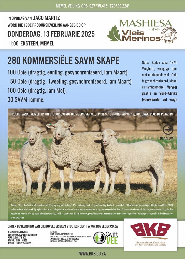 In opdrag van Maritz Bovelders tesame met Boshoek Bovelders word die volgende as te koop aangebied op Donderdag, 12 Februarie 2026 om 11:00 te Plaas Eksteen, Memel.