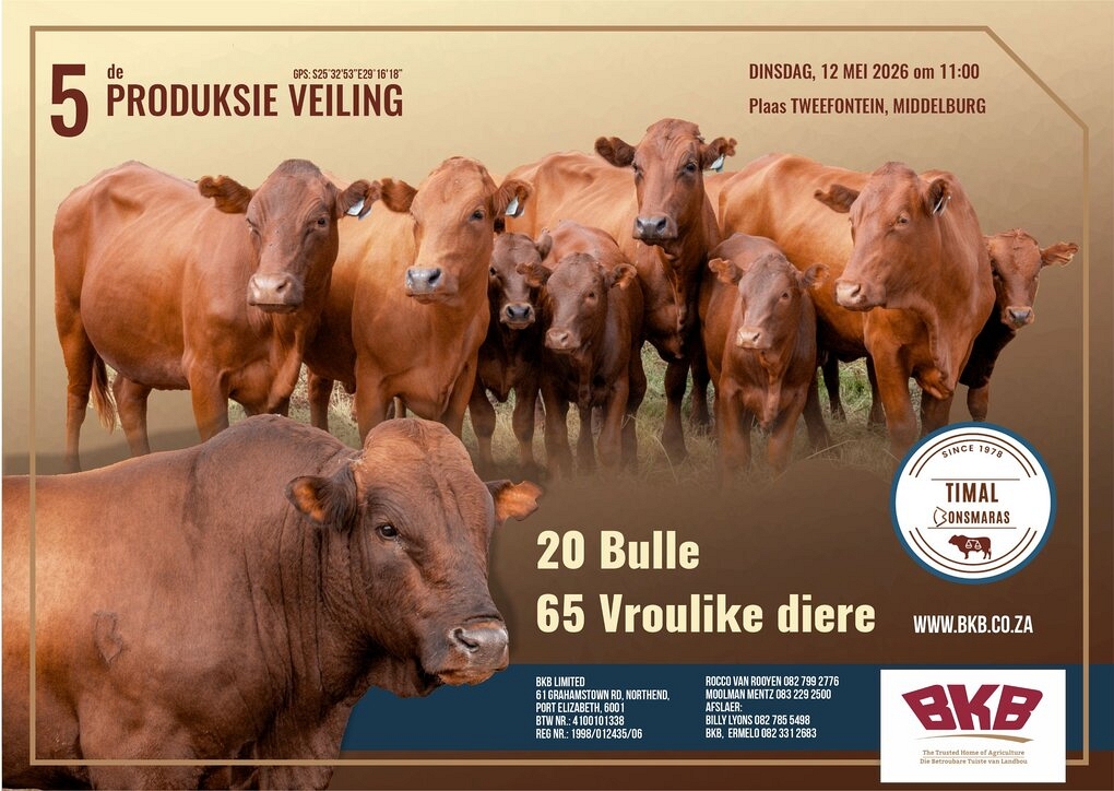 In opdrag van Timal Bonsmaras word die volgende te koop aangebied op Dinsdag, 12 Mei 2026 11:00 te Plaas Tweefontein, Middelburg.