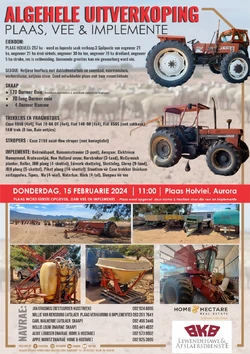 Algehele uitverkoping van Plaas, vee & implemente vind plaas op Donderdag die 15de Februarie 2024 om 11:00 te Plaas Holvlei, Aurora.