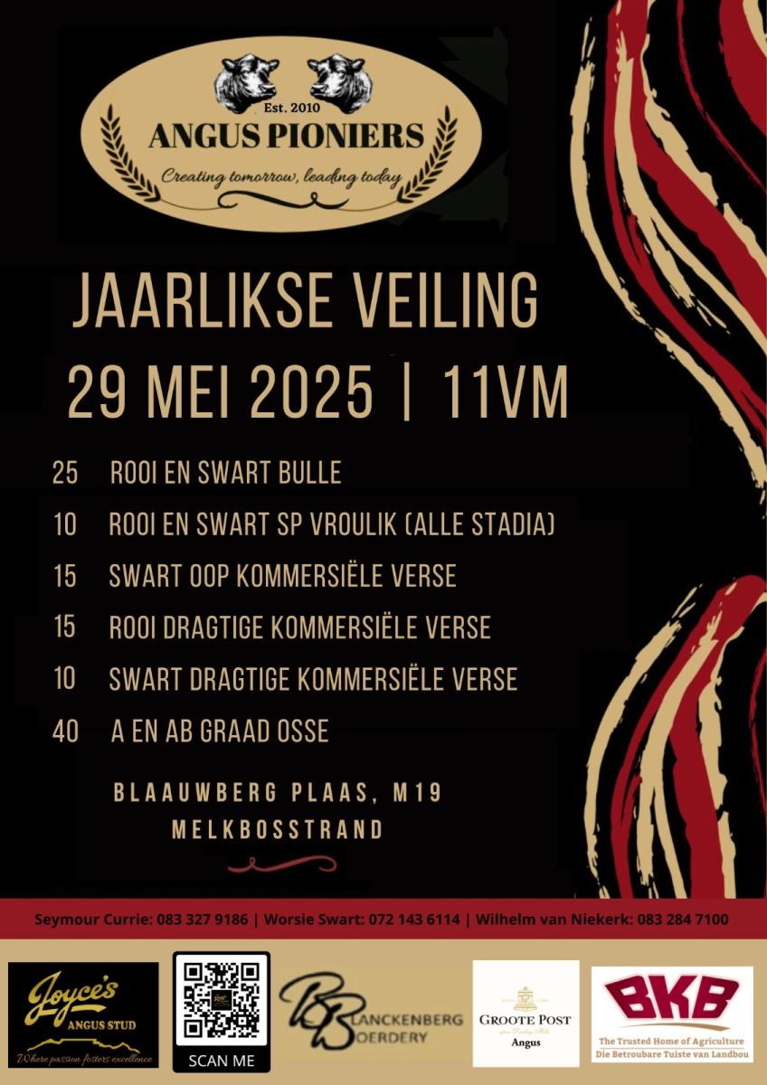 The Angus Pioniers Annual Sale will take place on the 29th of May 2025 from 11:00 at Blaauwberg Farm, M19, Melkbosstrand.