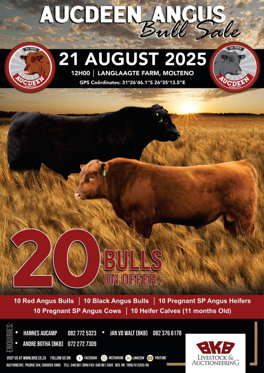 The Aucdeen Angus Bull Sale will take place on Thursday the 21st of August 2025 from 12:00 at the farm Langlaagte in Molteno.