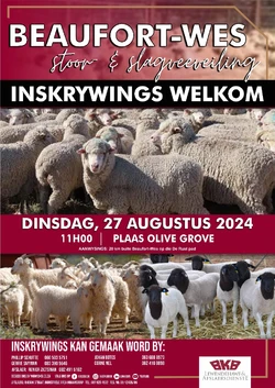 The Beaufort-West Storelamb Auction will take place on Tuesday the 27th of August 2024 from 11:00 on the farm Olive Grove.