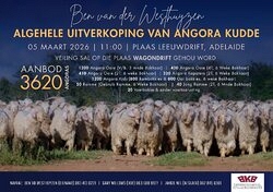Die Ben van der Westhuyzen Algehele Uitverkoping van ANGORA KUDDE vind plaas op Donderdag die 5de Maart 2026 om 11:00 te Leeuwdrift, Adelaide.