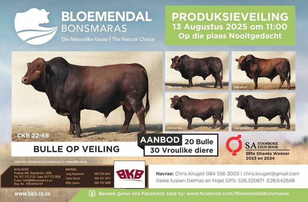 In opdrag van Bloemendal Bonsmaras word die volgende as te koop aangebied op Woensdag, 13 Augustus 2025 om 11:00 te Plaas Nooitgedacht, Nigel.