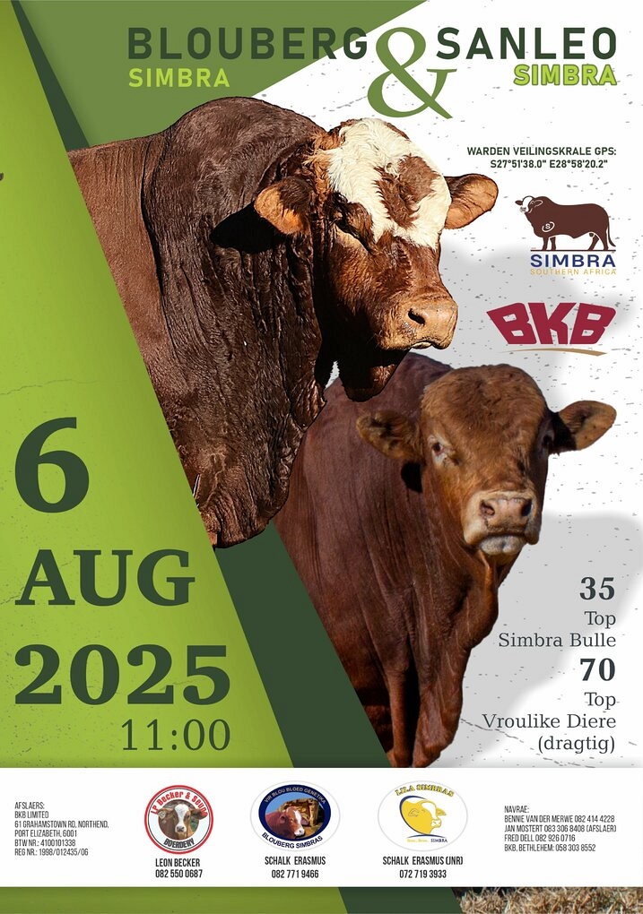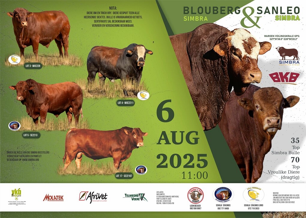The Blouberg & Sanleo Simbra Auction will take place on Wednesday the 6th of August 2025 from 11:00 at the auction grounds in Warden.