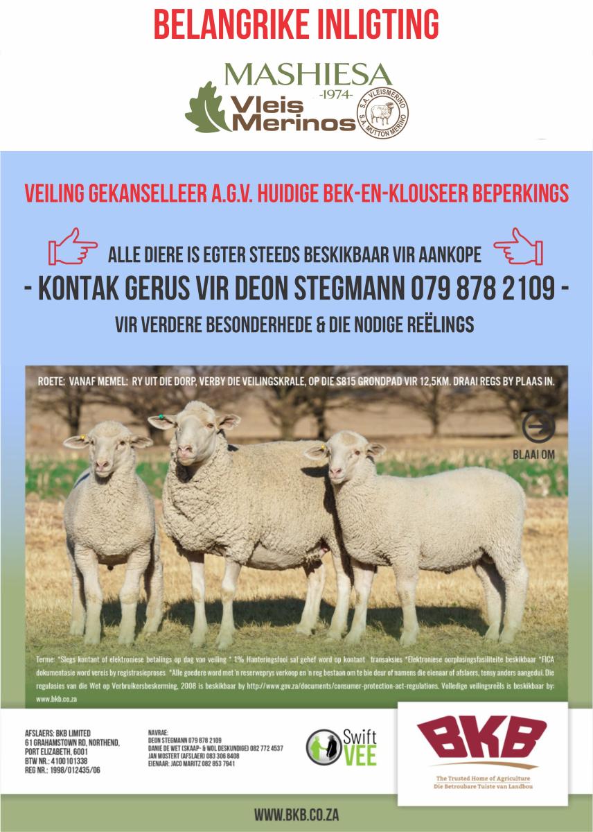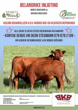 Nota: NOTA: BM getoets. Geen oorslaankoeie. Dragtigheid- status en prestasiedata sal dag met veiling beskikbaar wees. Vervoer gratis in Suid- Afrika (voorwaarde: vol vrag).
