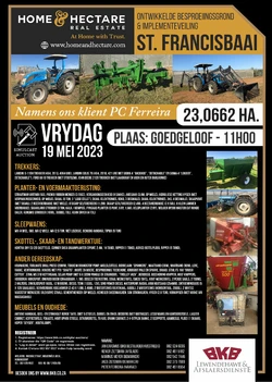 The Developed Irrigation and Equipment Sale on behalf of PC Ferreira will take place on Friday, 19 May 2023, from 11:00 on the Farm Goedgeloof, St. Francisbaai and on the BKB Digital Platform.