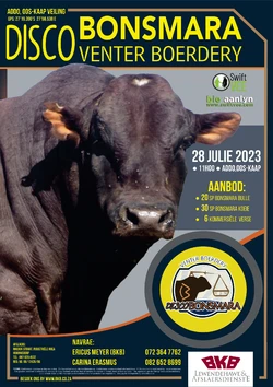 The Disco Bonsmara Production Auction will take place on 28 Julie 2023 from 11:00 at Addo, Eastern Cape and on the Swiftvee Online Platform.
