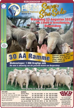 The FEM Dohne Merino Super Sire Sale will take place on Wednesday, 23 August 2023 from 11:00 at Sewefontein, Burgersdorp.
