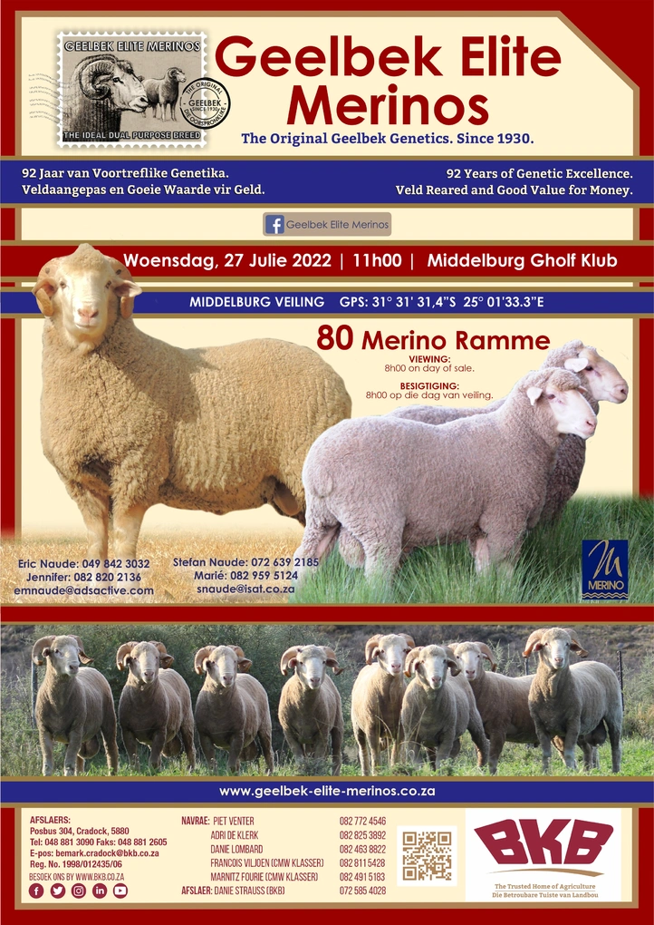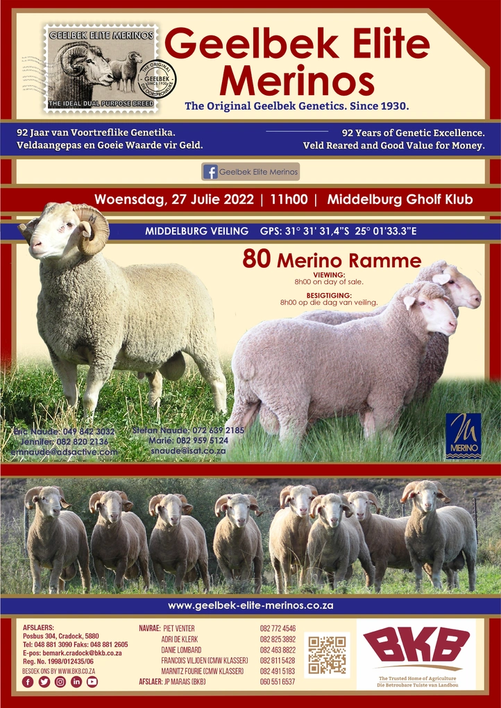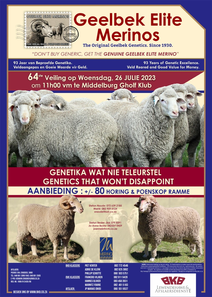 The Geelbek Elite Merinos Production Sale takes place on Wednesday the 26th of July 2023 from 11:00 at Middelburg, Golf Club.