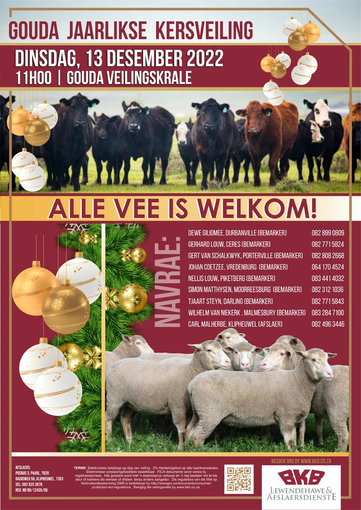 The Gouda Christmas livestock auction takes place on Tuesday 13 December 2022 from 11am at the BKB auction premises.