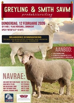 The Greyling & Smith Mutton Merino Production Auction will take place on Thursday, 12 February 2026 from 11:00 on the farm Ricksuhill, Dordrecht.