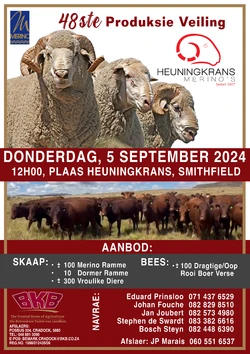 The Heuningkrans Merino's Auction will take place on Thursday the 5th of September 2024 from 12:00 at Heuningkrans in Smithfield.