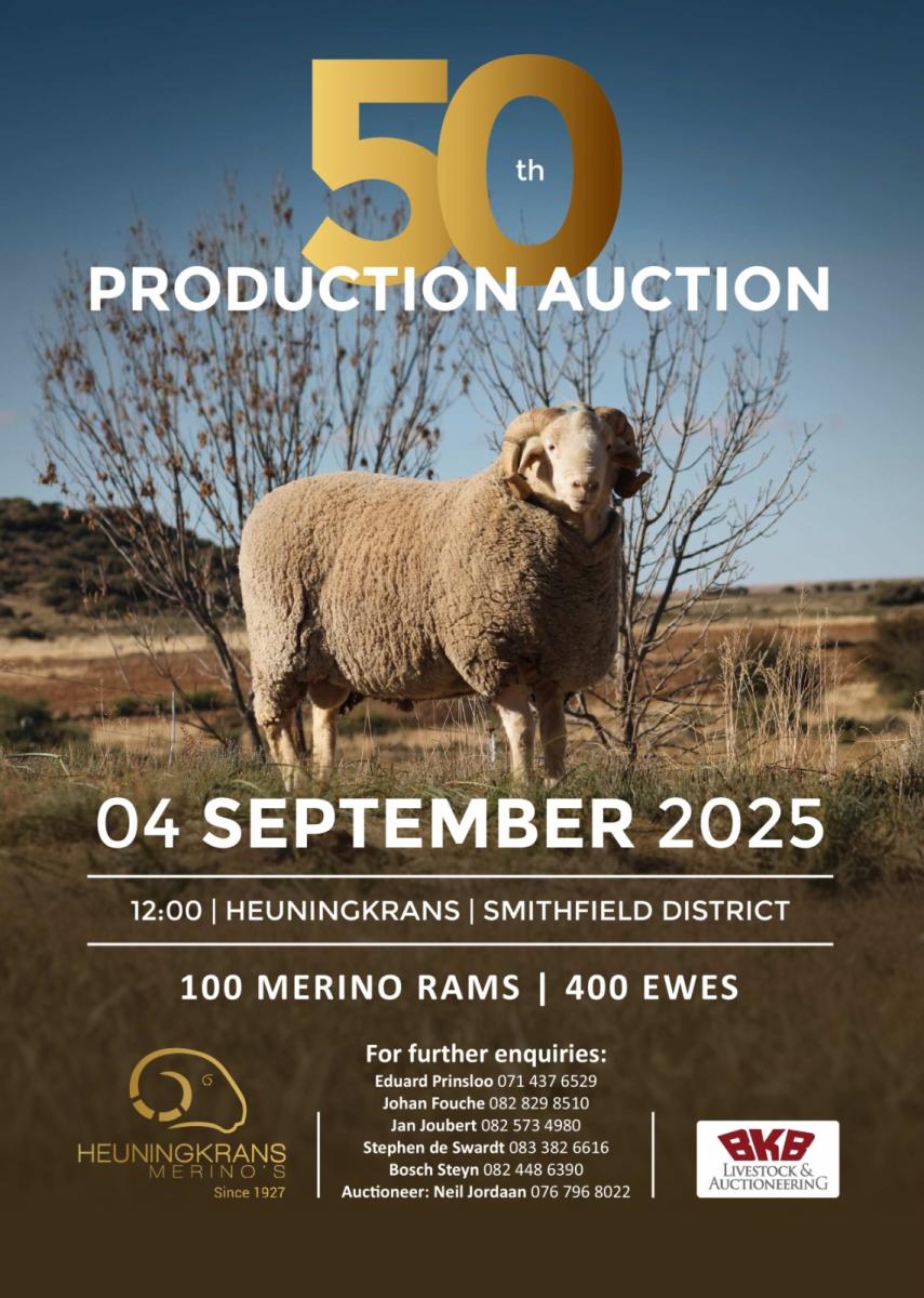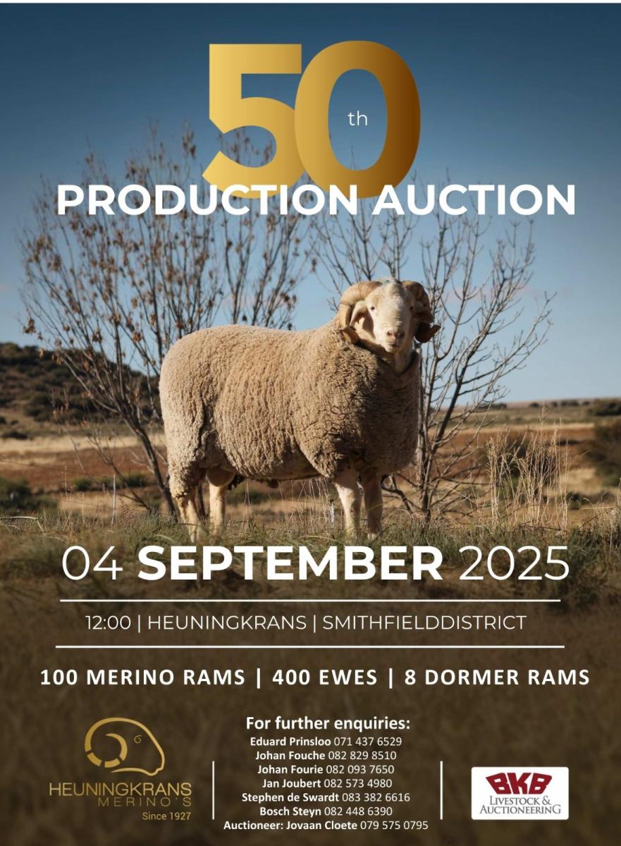 The Heuningkrans Merinos Production Sale will take place on The 4th of September 2025 from 12h00 at Heuningkrans Farm, Smithfield.
