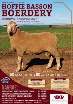 The Hoffie Basson Dohne Merino Production Auction will tale place on Wednesday the 7th of August 2024 from 13h00 at Kliprug in Malmesbury.