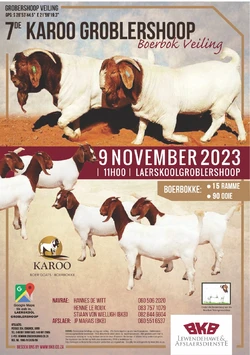 The Karoo Groblershoop Boer Goat Sale will take place on Thursday, 9 November 2023, from 11:00 at Laerskool Groblershoop.