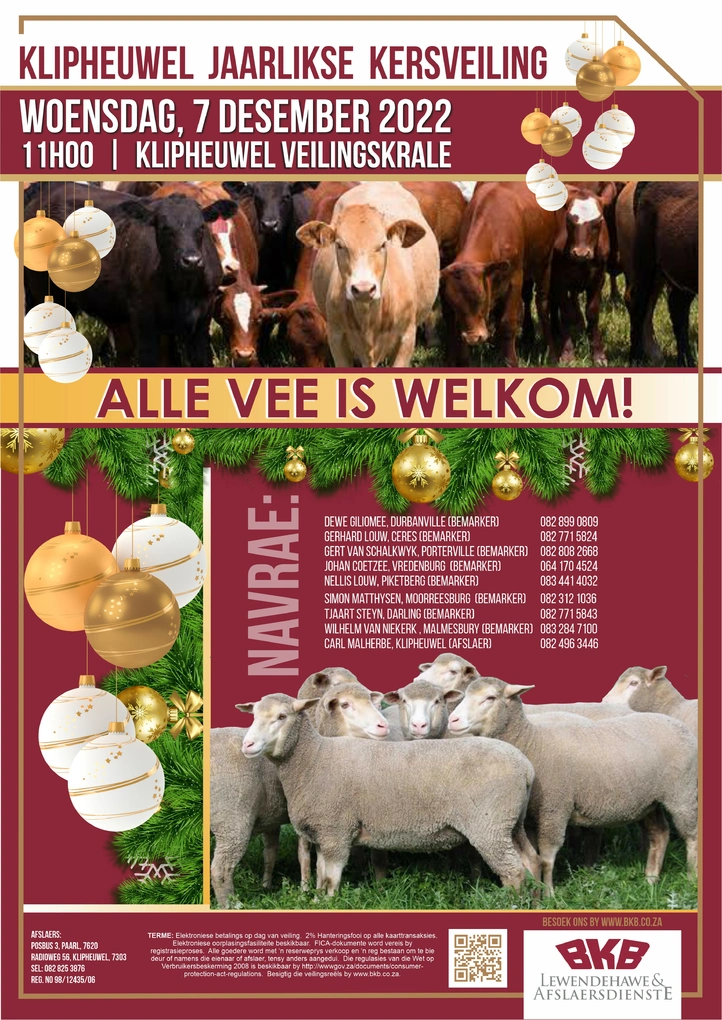 The Klipheuwel Christmas livestock Auction takes place on Wednesday7 December 2022 from 11am at the BKB Klipheuwel auction premises.