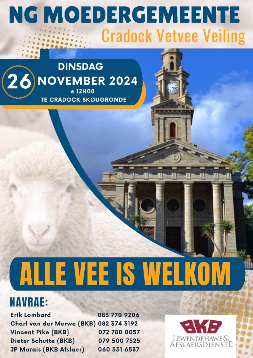 Die NG Moedergemeente - Cradock Vetvee Veiling vind plaas op Dinsdag die 26ste November om 12:00 te Cradock Skougronde.