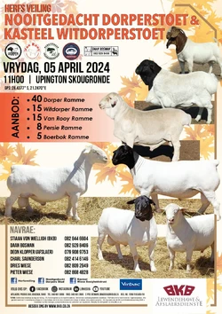 The Nooitgedacht Dorper Stud & Kasteel White Dorper Stud Auction will take place on Friday the 5th of April 2024, 11:00 at the Upington Showgrounds.
