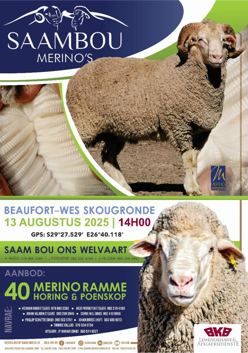 The Saambou Merino's Auction will take place on the 13th of August 2025 from 14:00 at the Beaufort - West Showgrounds.
