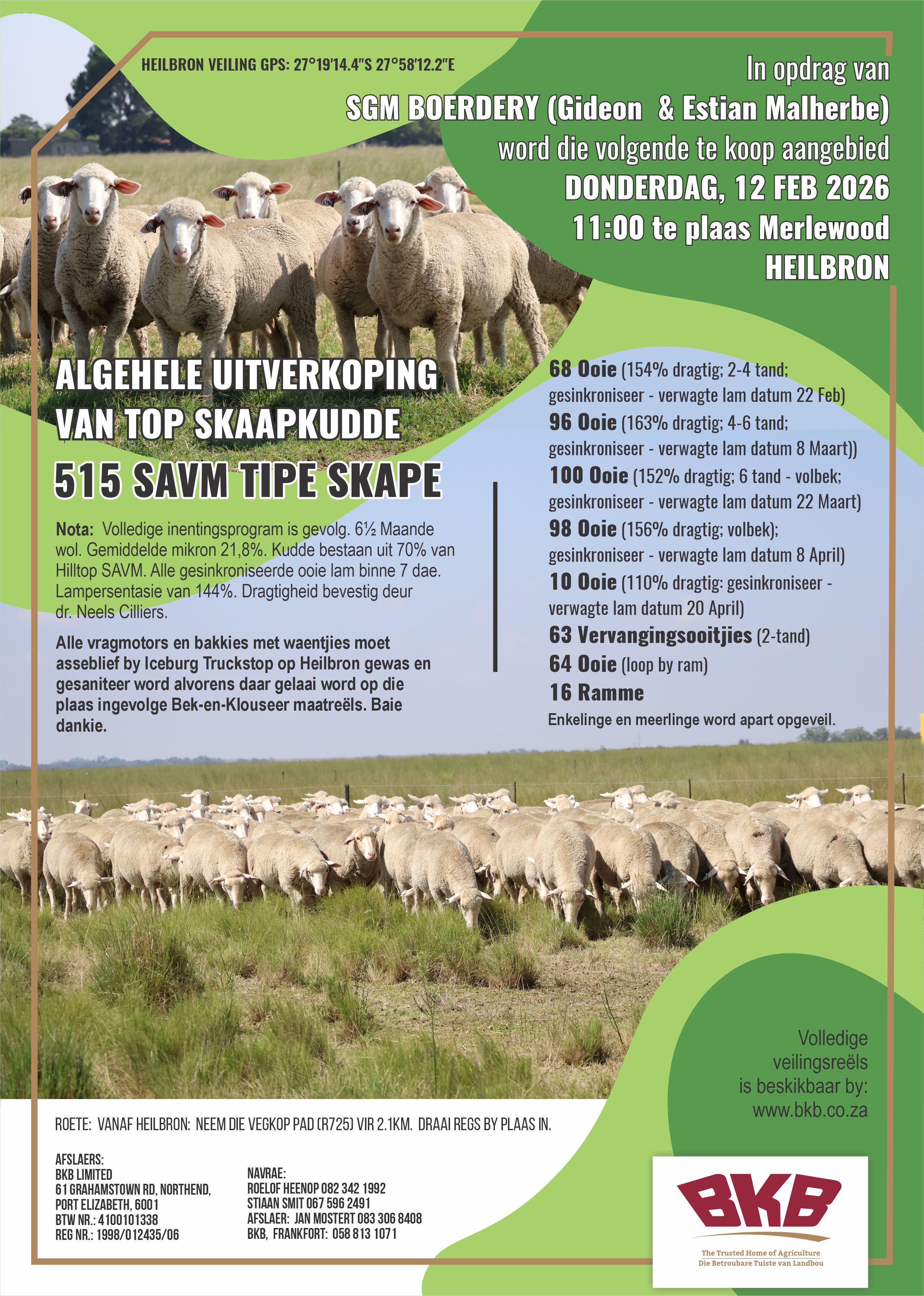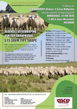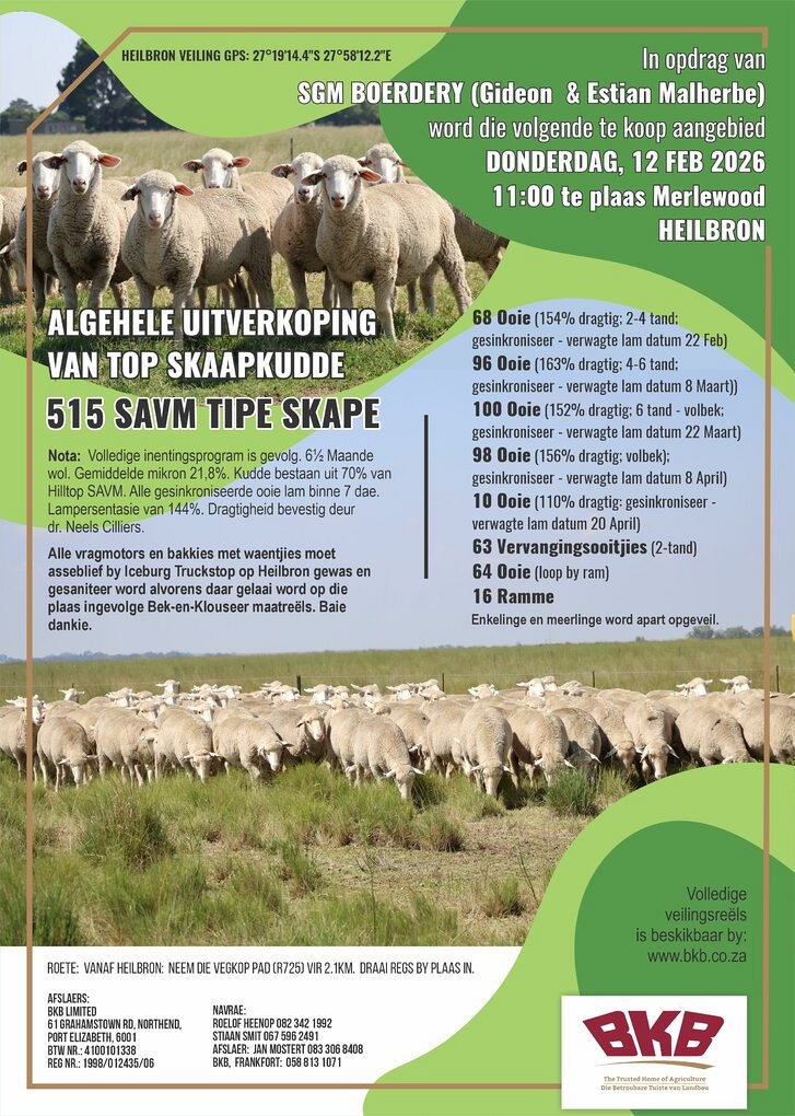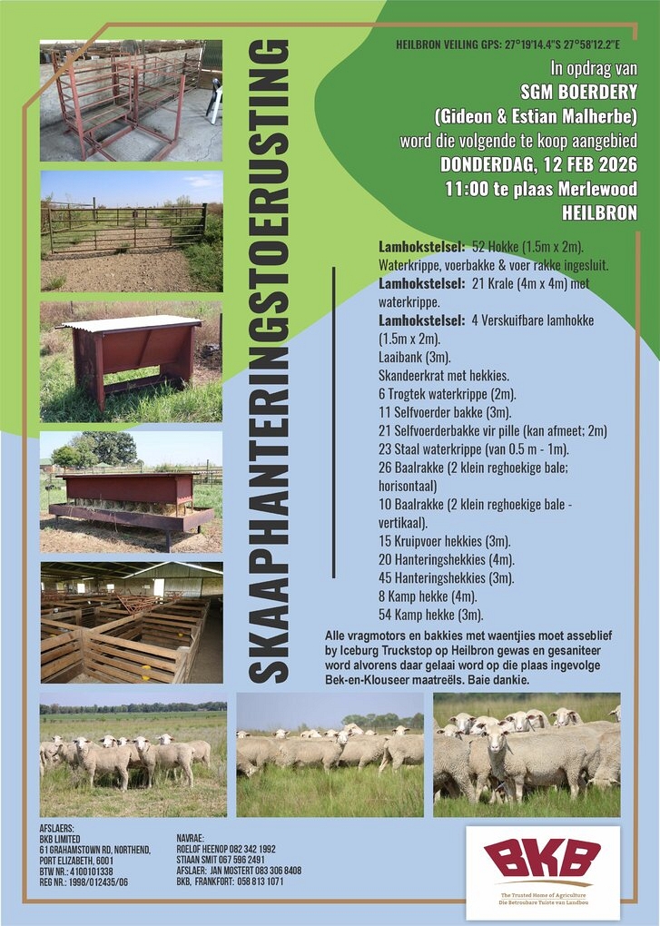 In opdrag van SGM Boerdery (Gideon & Estian Malherbe) word die volgende te koop aangebied Donderdag, 12 Februarie 2026 om 11:00 te plaas Merlewood, Heilbron.