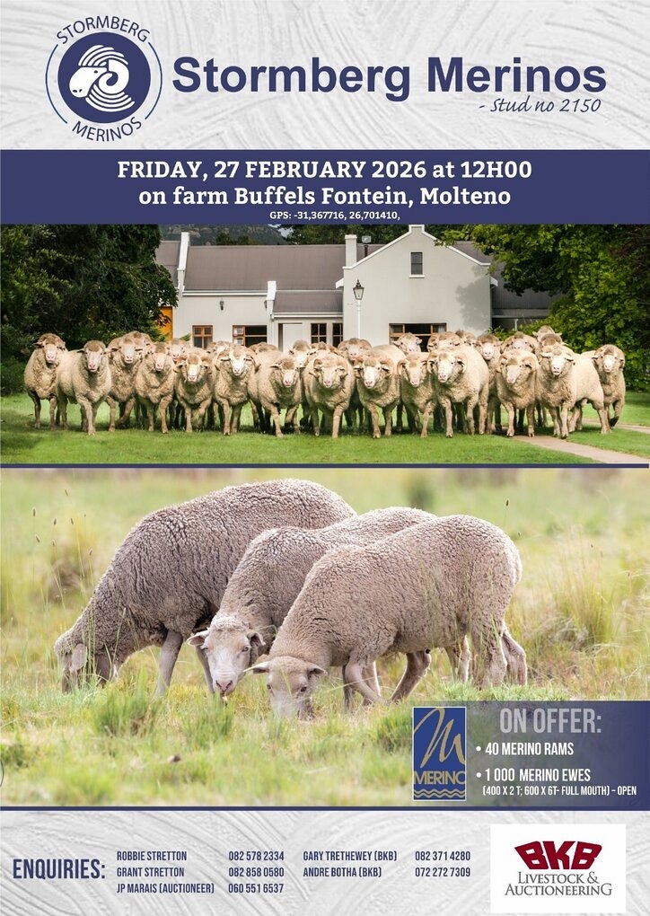The Stormberg Merinos Stud Sale will take place on Friday the 27th of February 2026 from 12:00 on the Farm Buffels Fontein in Molteno.