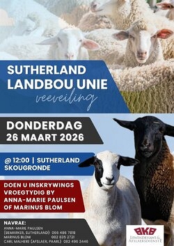 The Sutherland Landbou Unie Livestock Auction will take place on Thursday the 26th of March from 12:00 at the Sutherland Showgrounds.