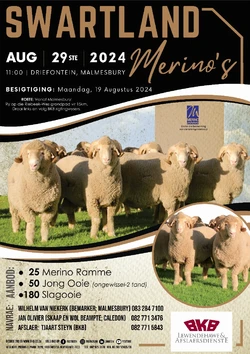 The Swartland Merino's Production Auction will take place on Monday the 19th of August 2024 from 11:00 in Driefontein, Malmesbury.
