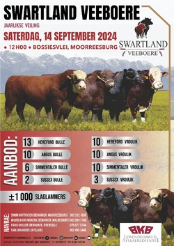 The Swartland Veeboere Annual Sale will take place on Saturday the 14th of September 2024 from 12:00 at Bossiesvlei, Moorreesburg.