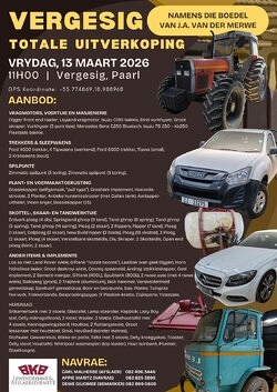Die Vergesig Totale Uitverkoping (namens die boedel van J.A. van der Merwe) vind plaas op Vrydag, 13 Maart 2026 om 11:00 te Vergesig, Paarl.