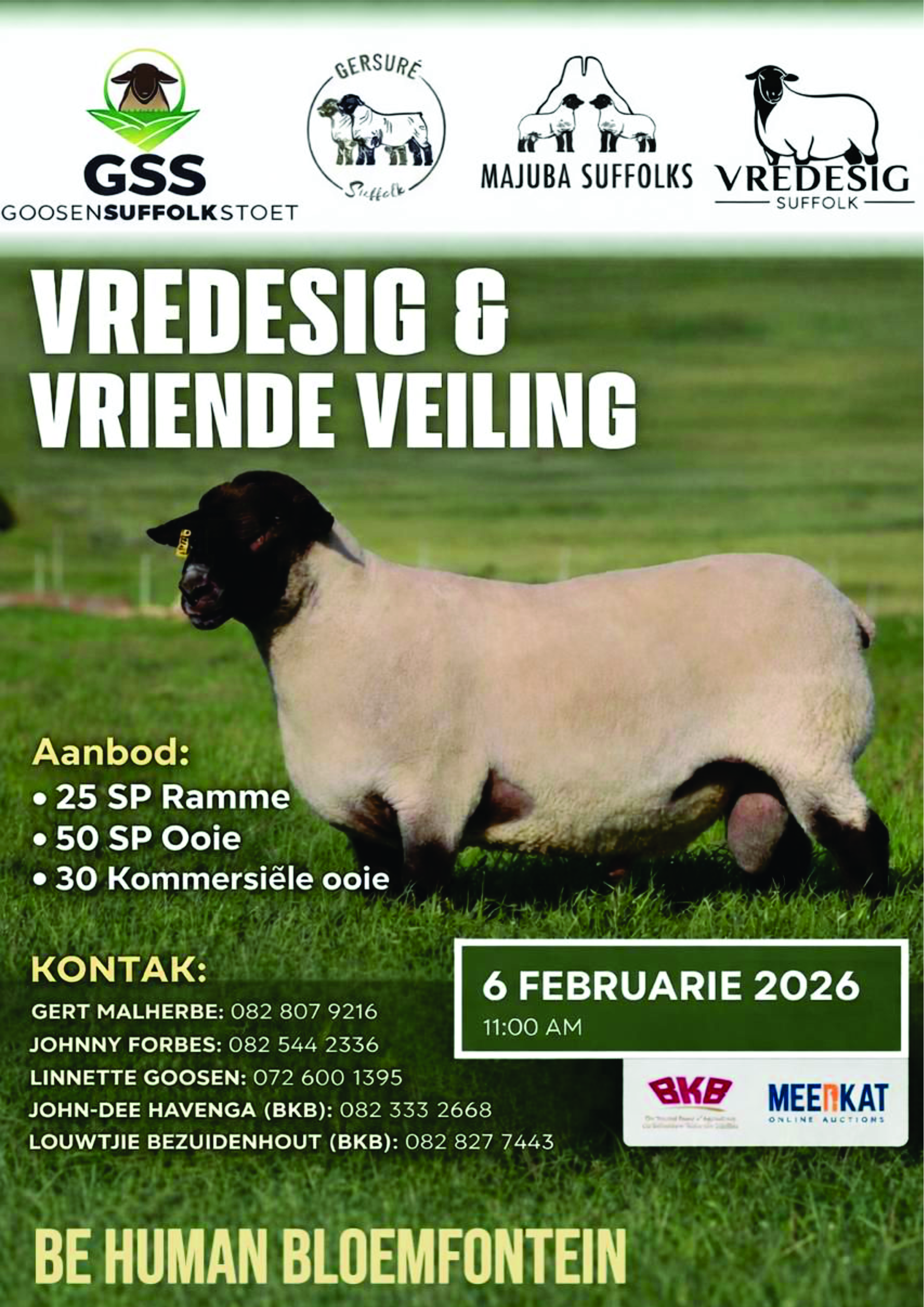 * Nota: Dragtigheidstatus en katalogus inligting sal dag van veiling beskikbaar wees. Veiling vind plaas onder die beskerming van die Suffolk Skaaptelers Genootskap.