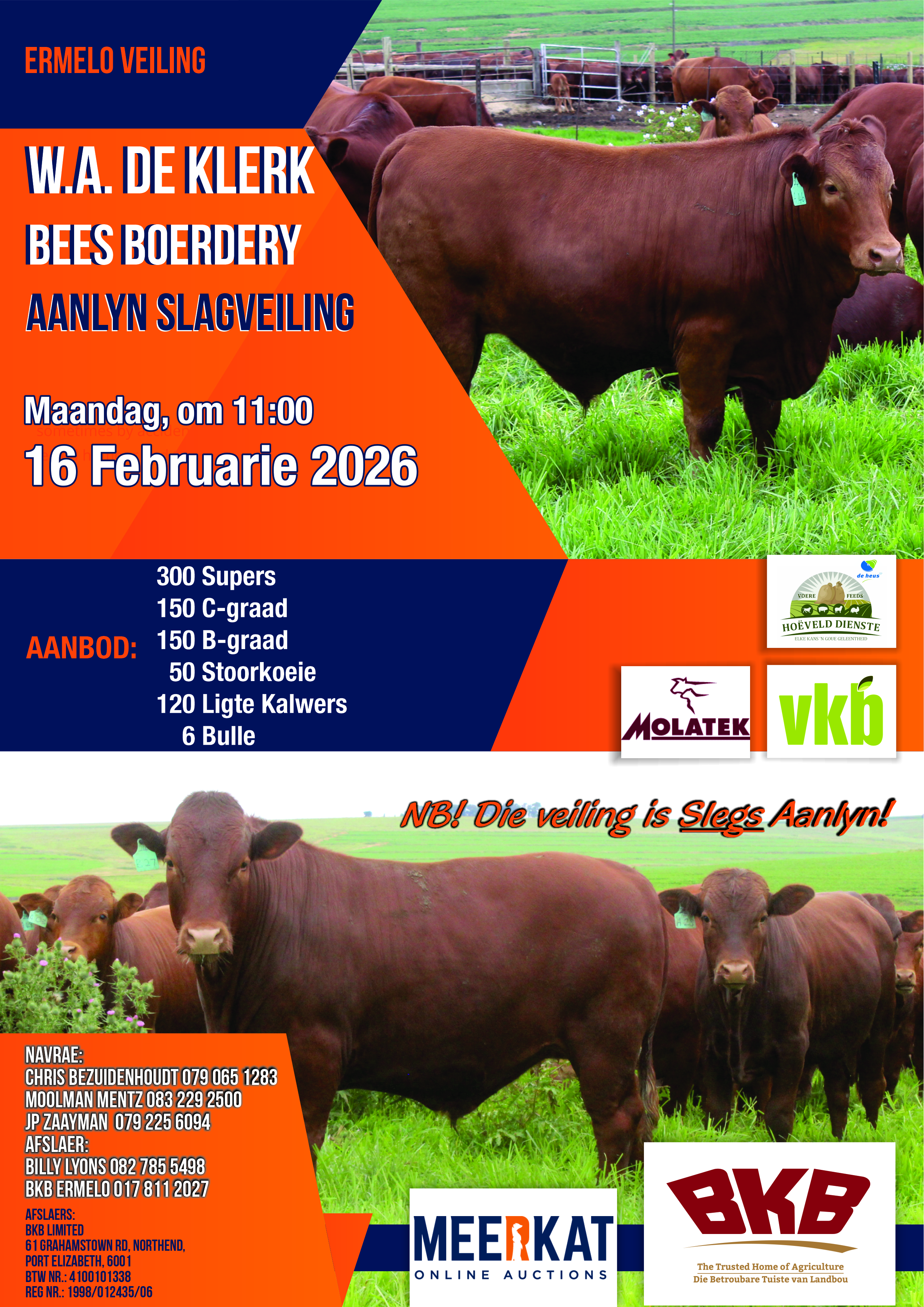 In opdrag van W.A. De Klerk Bees Boerdery word die volgende te koop aangebied op Maandag, 16 Februarie 2026, om 11:00 te Ermelo. Veiling is SLEGS AANLYN.