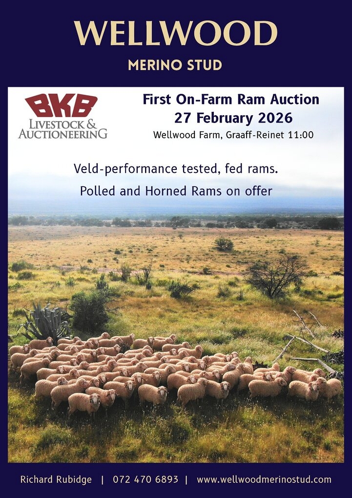 The Wellwood Merinos Sale will take place on Friday the 27th of February 2026 from 11:00 on the Farm Wellwood, Graaff-Reinet.