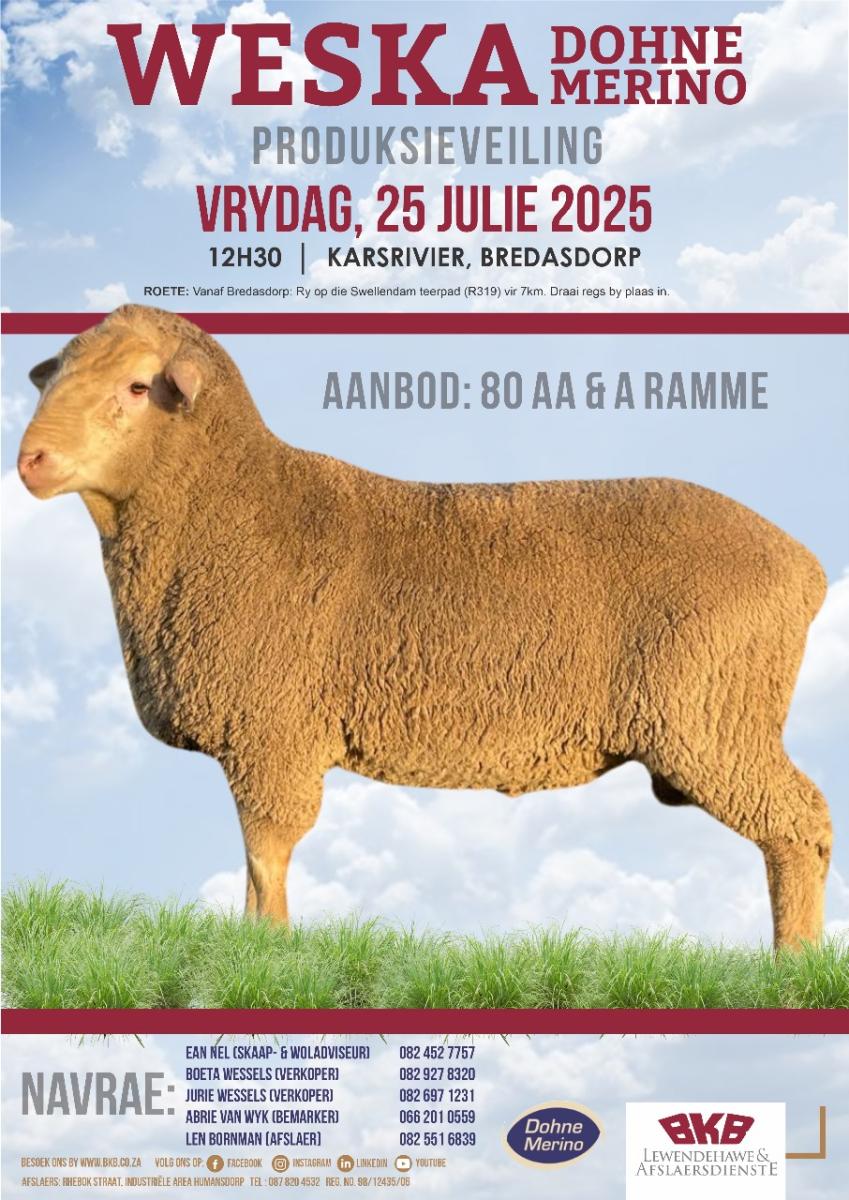 The WESKA Dohne Merino Production Auction will take place on the 25th of July 2025 from 12:30 at Karsrivier, Bredasdorp.