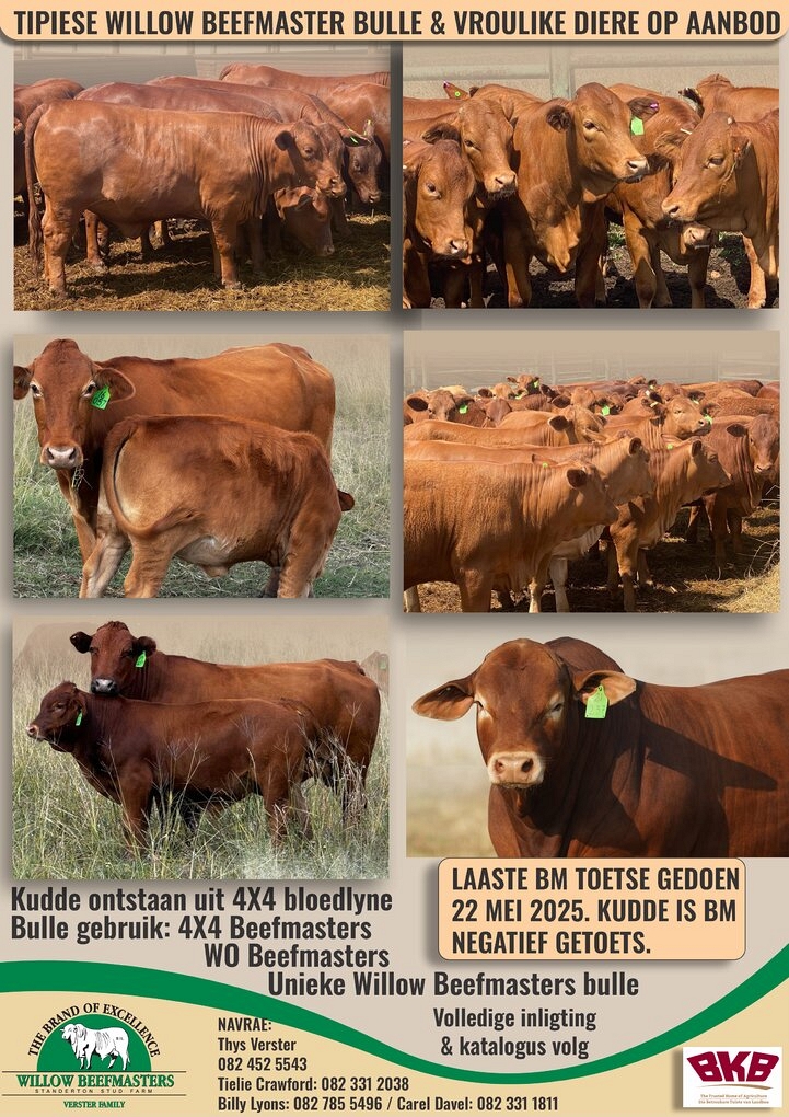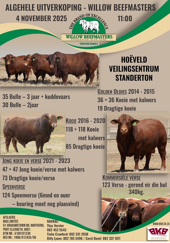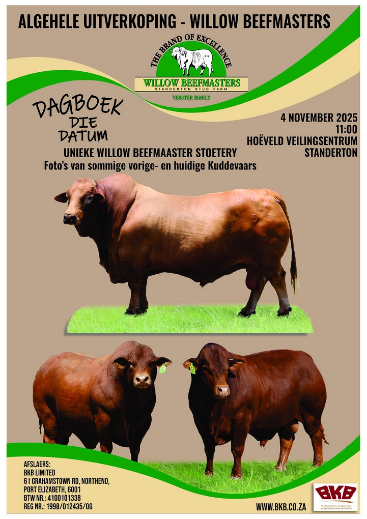 In opdrag van Willow Beefmasters word die volgende as te koop aangebied op Dinsdag, 4 November 2025 om 11:00 te Hoëveld Veilingsentrum, Standerton.